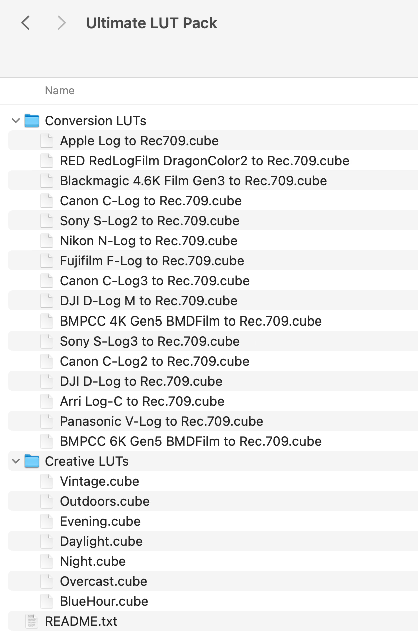 7 Creative LUTs (Daylight, Vintage, Night, Blue Hour, Evening, Outdoors, Overcast) and 16 Conversion LUTs for converting major camera log formats to Rec. 709.